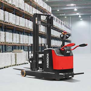 Ce gerbeur combine les avantages des gerbeurs standard et des chariots à mât rétractables. Il peut être utilisé pour des palettes fermées et il n’est pas équipé de bras au sol.